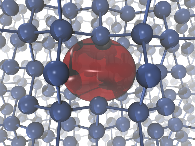 In the Work_positron directory, you will also find a tpositron_2o_DS2_DEN_POSITRON file, containing the positron density. Visualizing this file (using e.g. cut3d and XcrysDen or VMD) you can see that the positron is localized inside the vacancy. You can see below how the positron (in red, isodensity at 30% of the maximum density) localized the silicon monovacancy looks like: